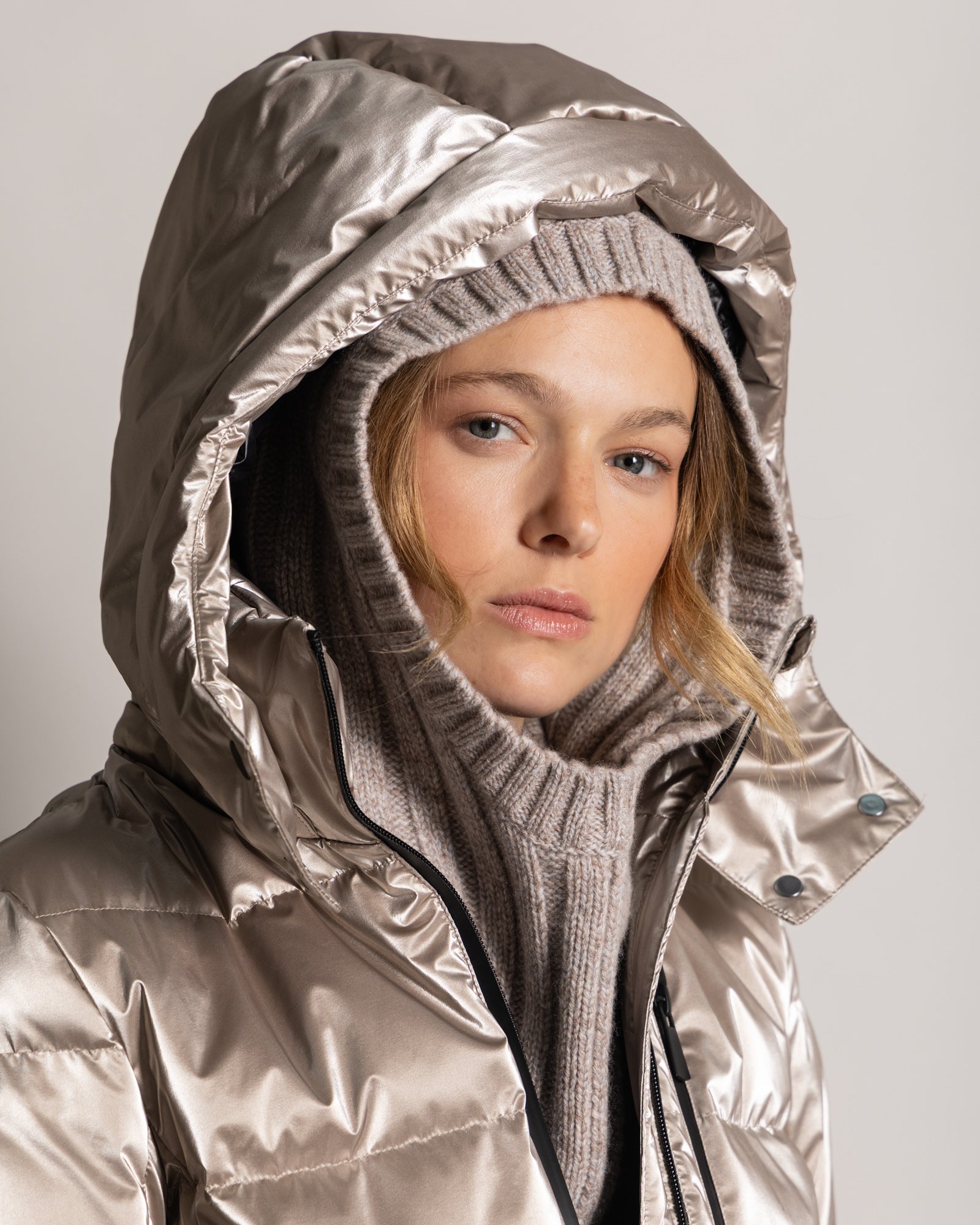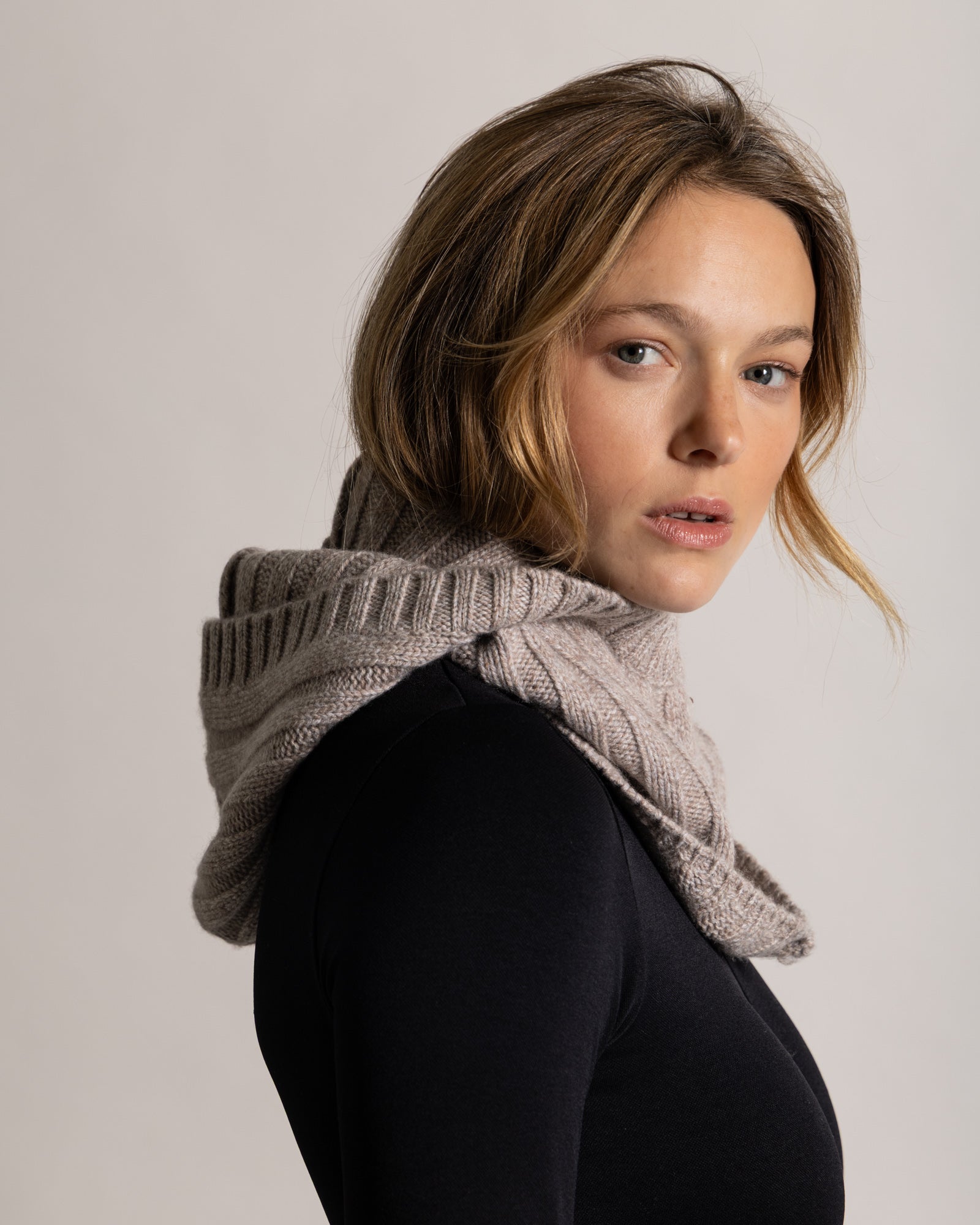 Knitted in 12-ply knit for extreme comfort, this thick, wrap-around hood combines protection, softness, and warmth. Ideal for facing the coldest temperatures.